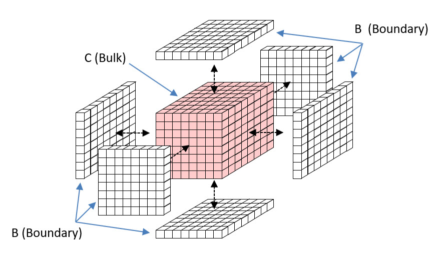 Fig.2: Depiction of a 3D bulk, C, consisting of 8x8x8=512 binary planckons and its boundary, B, that is the union of the six 8×8 2D arrays of planckons, for a total of 384 planckons, that wraps the bulk.